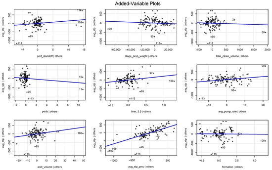Figure 5 shows the added variable (AV) plots for model 2 from R. Since creating 2-D visuals for multiple regression is impossible, the best way to view individual effects is through AV plots. The plots are constructed so that the dependent variable (average STP) is on the y-axis and an independent variable is on the x-axis. These plots differ from the bivariate regression constructed in Mohaghegh (2019) in that these are accounting for other independent variables that are being held constant. Therefore, each plot shows the individual effects of one independent variable, with all other independent variables being held constant on the dependent variable.