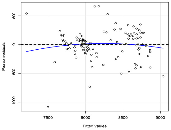 Figure 7 is a plot of the residuals vs. the fitted values for model 2. A residual is what is not explained by the model and is simply the fitted value minus the actual value at each data point. The most important thing to note is that there is not a clear trend in the residual values, which would indicate a different regression model may work better. With no clear and present trend in the residuals, this is the first piece of evidence that the linear model constructed in this study may be appropriate.
