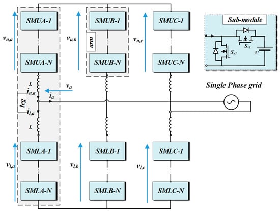 A three-phase MMC based EV drive system was proposed in [] by replacing the conventional submodule (SM) capacitor with an embedded battery (EB), as shown in the sub-module insert in Figure 1. Each phase leg has an upper and a lower arm with the same number of SMs (N). The converter is fully scalable, modular, and can be controlled to operate in the four quadrants of operation modes. The MMC-EB is utilised to drive an EV three-phase traction motor in [,,,]. Due to the bi-directional power flow capability, charging from a three-phase source is a possible charging option of the MMC-EB, similar to a regenerative braking mode operation in an EV. An MMC-EB is investigated as an integrated three-phase EV battery charger in []. A traditional three-phase MMC is studied as a non-integrated battery charger in []. However, the connection of the three-phase MMC-EB to a single-phase grid to charge the embedded batteries requires a modified control algorithm and alteration of the converter hardware. The authors from [] proposed a charging method for an MMC-EB from a single-phase supply with the same hardware configuration as the three-phase converter. In that method, two legs are connected to the single-phase supply and have a two-leg state of charge (SOC) controller. A third leg SOC controller also controls the third, disconnected leg, average SOC. In addition, balancing of the SOC of the individual batteries in [] is based on PI controllers which increases the system complexity. For the single-phase charger detailed in this paper, in the developed control system, the converter’s unconnected leg has no dedicated average SOC controller. Instead, the third leg voltage is set to be the nominal DC bus voltage. Moreover, there is no arm control in the third leg, but an individual SOC controller as detailed in the converter control section. Gao et al. [] provided a redistributed PWM modulation technique of an MMC-EB connected to AC grid during submodule faults. The fault override method is based on the redistribution of the PWM waveform and the method mainly suits PWM modulated inverters. For the override method presented in Section 3 of this paper, the override occurs during the sorting stage, giving this method flexibility to be employed with different modulation schemes.