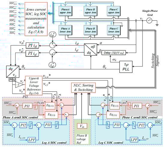 As observed from Equation (6), the leg power is a function of the phase voltage and current, in addition to a DC power component that can be exchanged between legs. An appropriate SOC controller can be utilised to equalise the average SOC () of the converter legs []. The average SOC in a converter leg can be calculated from the equation: