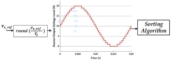 where is the number of required levels during sampling time () and ranges from 0 to N. Based on , the sorting algorithm inserts the same number of SMs to generate the required output voltage. The sorting block assigns an index to each SM, then arranges the SMs according to their SOC in an ascending order. SMs are inserted or bypassed according to their SOC and arm current direction as follows: