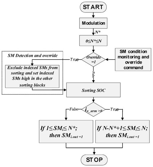 The developed override method initially considers an undesirable increase in the temperature of an EB, where an elevated battery temperature over time can degrade the battery and reduce its functional lifetime []. The sorting algorithm can be also utilised to isolate a SM-EB that undergoes an unacceptable SOC deviation. Furthermore, this sorting method can be extended to bypass a SM for any other definable fault. Utilising this sorting block to override a SM gives a degree of decoupling and can be implemented with any type of MMC PWM method.