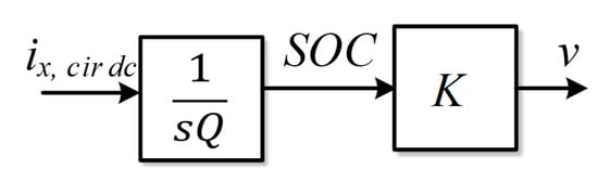 As shown in Figure 2, the SOC for converter legs A and C are controlled via circulating current components (DC and AC). Each leg average SOC ( is compared to the total average SOC of the converter. Then, a PI controller (PI2) calculates the required reference DC current to be exchanged with converter legs to equalise . A low pass filter separates the actual DC circulating current component to compare it with the reference current component. The inner PI controller (PI3) generates a leg balancing voltage . The converter’s unconnected leg is controlled to produce a constant DC voltage, the converter nominal DC voltage, to emulate a single-phase full bridge operation of an MMC-EB. This is achieved by setting the reference voltage to the nominal DC voltage of the converter ():