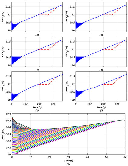 SOC of individual batteries in the converter arms showing the overridden battery in each arm (dashed red line): (a) upper arm in phase A; (b) lower arm in phase A; (c) upper arm in phase B; (d) lower arm in phase B; (e) upper arm in phase C; (f) lower arm in phase C; (g) phase A upper arm during equalisation period.