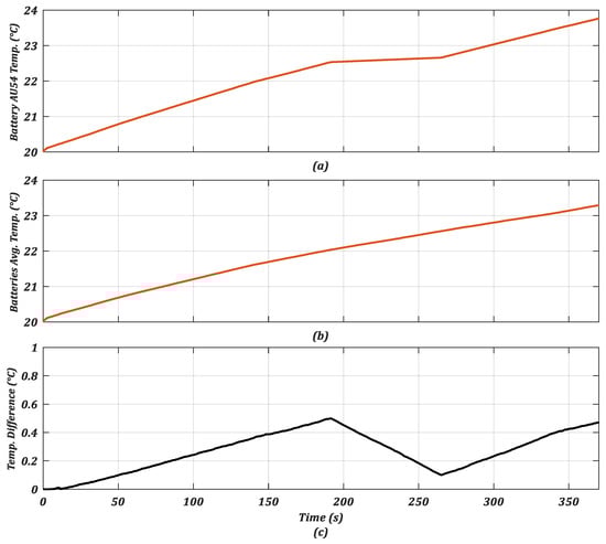 (a) Battery 54 temperature, (b) batteries’ average temperature; (c) temperature difference.