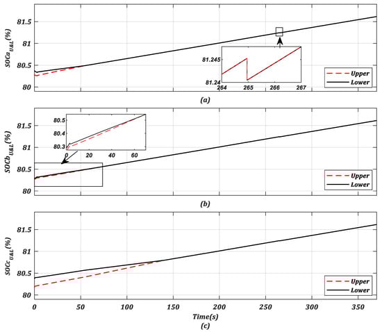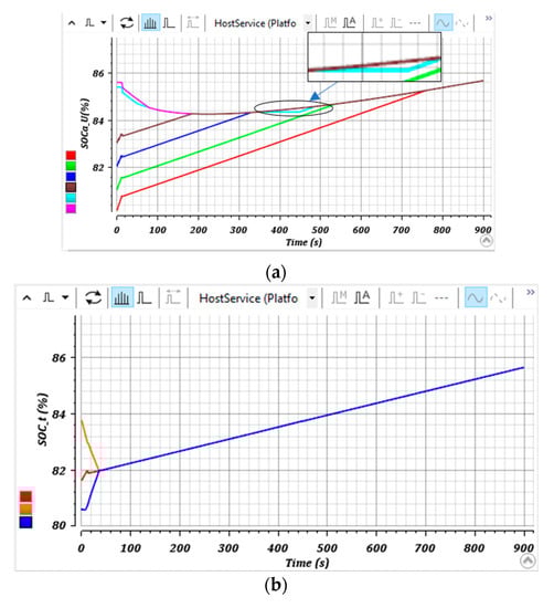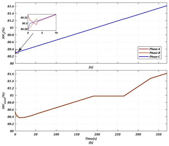 In the following case, a three-phase MMC-EB is connected to a single-phase grid. Simulation parameters are shown in Table 1, and the sampling time () is 50 µs. To emulate the expected normal narrow SOC operational range and decrease initial equalisation time, initial EB SOC values are distributed randomly from 79.90% to 80.65% in the converter arms, as shown in Figure 7. Each SM-EB has two identical series cells with a rated voltage of 3.6 V each. It is assumed that both cells have the same SOC and no internal cell balancing is required per SM. In a commercial application of the MMC-EB, each SM could have a single cell to eliminate any additional SOC balancing elements. Battery SOC is equalised for all SMs within 75 s from the start of the simulation according to the implemented control arrangement.