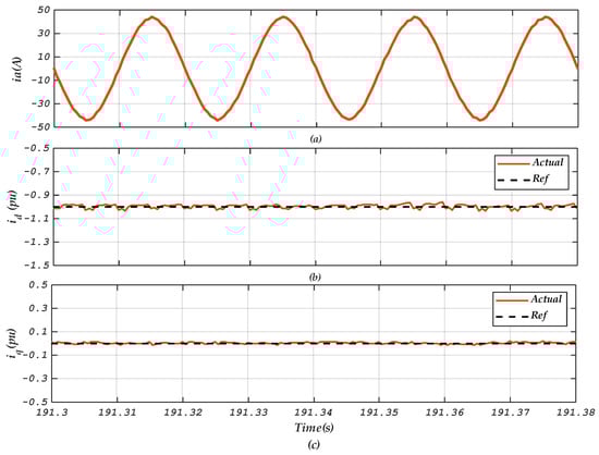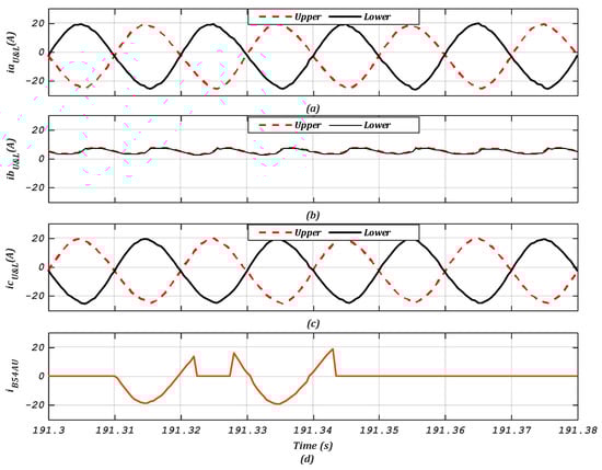 Of note here is that during the SM override period, the average SOC values in the converter arms and legs are unchanged. This is achieved by isolating the same number of the bypassed SMs in each converter arm. Upper and lower arm currents in phase A, B, and C are shown in Figure 11a–c respectively. Figure 11d shows the bypassed battery current before and after isolation. Phase A current is shown in Figure 12a. The current active and reactive current components are shown in Figure 12b,c respectively.