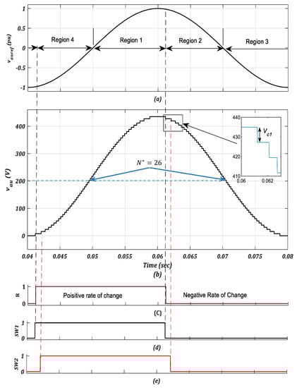 The open loop switching algorithm principle is to switch each SM for a constant switching period. This period can be identified and triggered by switching levels (N) in Equation (10). When increases by an integer step, a SM will be switched on. During switching on, all SMs are sorted in an ascending order from top to bottom. The SM that has an order number that is equal to the value will be switched on. To switch off a SM, SMs are sorted in a descending order from top to bottom. This means the earlier a SM is switched on, the greater its priority to be switched off. As a result, not only is the level number the main trigger to switch on or off a SM, but also the direction of the voltage reference. In the NLC modulated waveform, the same number of active levels is repeated twice during any reference voltage full cycle, as shown in Figure 13. As an example, level number 26 is repeated twice during a full voltage cycle. Thus, the developed switching algorithm requires another identifier to determine which sorting order is to be selected. The second identifier is the rate of change in the reference voltage, as shown in Figure 13c. When the switching levels are increasing, the rate of change flag (R) has a positive value, otherwise R equals zero. According to R values during a reference voltage cycle, there are four switching regions, as shown in Figure 13a. The switching regions are divided as follows: