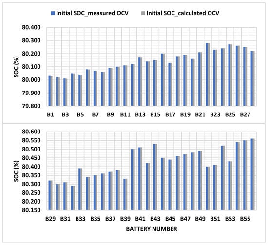 The proposed novel SOC estimation method shows an accurate estimation of the batteries’ initial SOC. Practically, the implementation time of this method is in the milliseconds range. The utilised open loop switching method can be modified to charge individual batteries in the same arm at the same rate. This can be implemented by adding a rotation sequence to the switching periods, to confirm that the batteries are equally experiencing the same current.