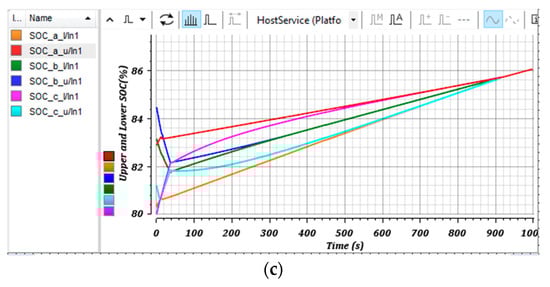 The converter has 56 SMs per arm, as in the simulation in Section 4.1. The SOC of only six batteries in phase A upper arm is shown in Figure 17a due to the storage limitation of the real-time acquisition and the plotter of the control desk. The six batteries are selected to show the minimum and the maximum values of the SOC in phase A upper arm including the overridden battery. Instead of the temperature difference trigger that was used in simulation results to override a SM, the override trigger in the real time system is set and reset based on a timer. Battery 54 is isolated at t = 350 s from the emulation start and is restored again at t = 450 s. Figure 17b shows the average SOC in the phases A, B, and C. The arm average SOC is shown in Figure 17c.