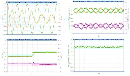Real-time emulation of the MMC-EB charging system: (a) the grid voltage and the line current; (b) the arm currents in phases A and C; (c) active and reactive line current components; and (d) the arm currents in phase B.