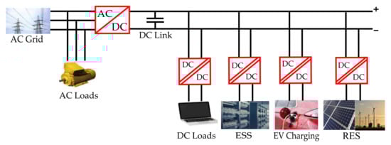 To improve the stability of IDS, virtual inertia control (VIC) techniques have been studied and implemented in [10,11]. VIC is proposed mainly to reduce the voltage fluctuations and frequency deviation in the AC bus by the inverter in IDS. This process involves power injection/absorption, mainly to/from the batteries connected with a bidirectional DC-DC converter [12]. It stands clear that the DC bus voltage should be kept constant, permitting optimal inverter operability and achieving frequency and voltage stability in the AC bus using VIC. The control of IDS systems is very complex, and its effectiveness is unequivocally related by one side to the selection of the converter and by the other side to the considered control strategy.