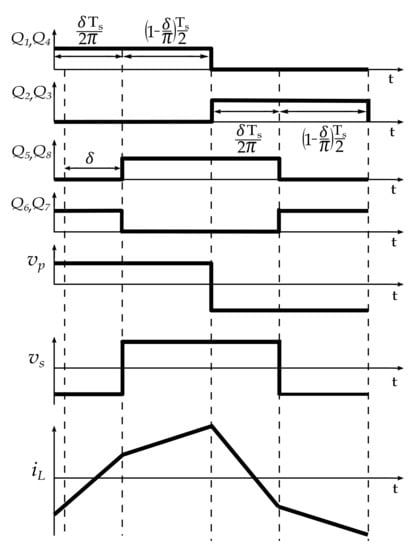 The considered DAB converter model hinges on the conservation of the average value of the power P δ , t flowing in the DC input section, high-frequency switching bridge section, and DC output section,