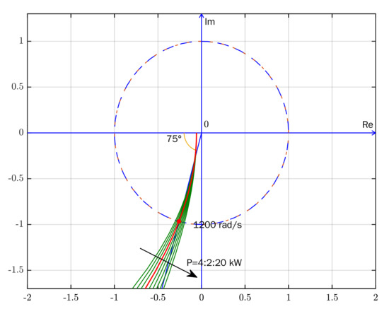 Figure 9. Nyquist plot of the open-loop frequency response L ω , T s = C i ω , T s G v i ω , T s with the nominal power load value (red) and under load variation from 4 to 20 kW (green).