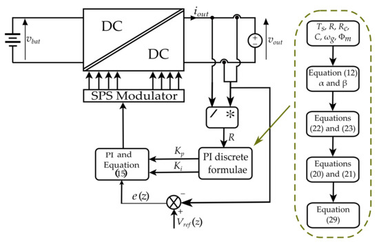 In this paper, the selected form of the regulator is the well-known discrete PI controller based on the trapezoidal integration method [33]. This choice is due to the simple structure of the PI controller, its wide use in microgrid controls, and its capability to automatically guarantee zero steady-state error on DC voltage step response. Moreover, discrete formulae for obtaining PI parameters as a function of DAB converter parameters are derived and presented. These parameters are derived through the so-called inversion formulae design method to exactly meet the gain crossover frequency and phase margin design specifications [34]. Since a phase margin equal to 75° guarantees good robustness on DAB converter and control system parameter variations, the PI proportional gain and integral time parameters can be analytically computed to exactly meet the given gain crossover frequency. Since the variation of this specification affects the response dynamic, it could be seen as a design requirement degree of freedom on the base of different operating modes of the DAB converter. For example, during the charging process of a battery, the DAB converter can be controlled to realize constant current (CC) mode, constant power (CP) mode, and constant voltage (CV) mode, while, when the battery works as an energy generator, the DAB converter control challenge is to stabilize undesired oscillations due to load variations promptly. When a large load power variation is generated, the control could be improved by changing the gain crossover frequency requirement. The presented discrete formulae for PI parameters can be easily implemented in a control algorithm for real-time parameters variation.