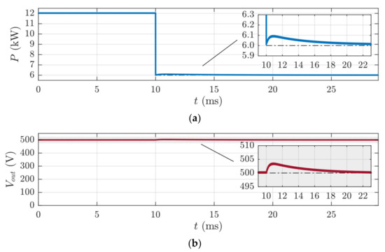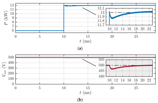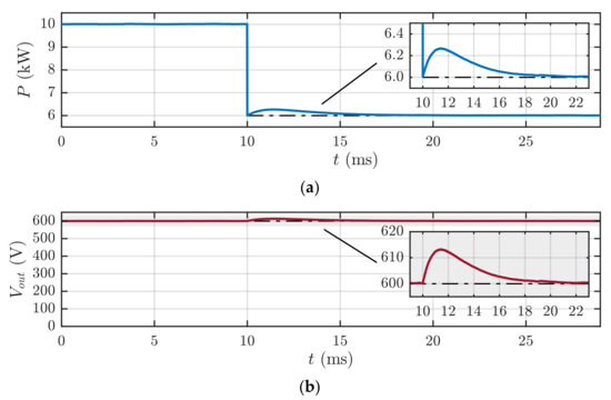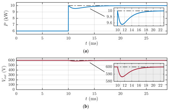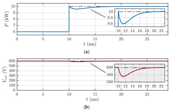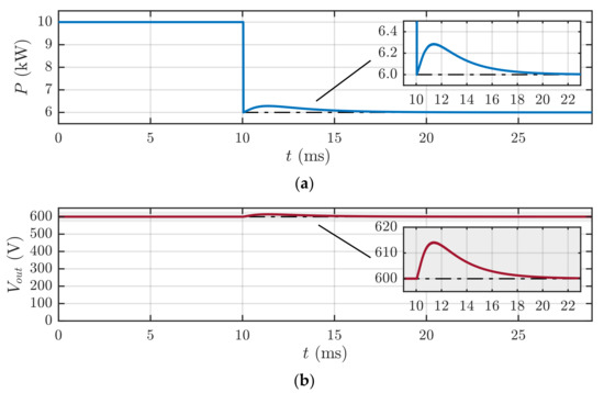 Figure 12 shows the output power and voltage changes when load abruptly decreases from 10 kW to 6 kW at t = 10 ms. During this load transient, the DC bus voltage reaches a peak value of 614 V, and again the control allows the new steady-state within t = 11 ms. Moreso, in this case, voltage evolution is well limited within the ±5% boundary.