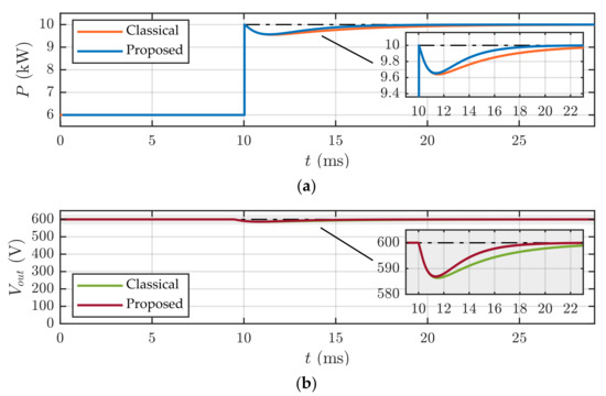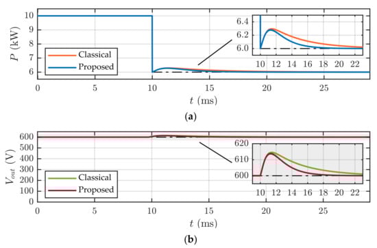 Apart from the previous discussion, to evaluate the effectiveness and to understand the robustness of the proposed discrete model, a comparison with the classical pole-placement method is studied in this section. Considering the same Table 2 circuit design specifications, new PI parameters are calculated using the classical pole-placement method for the second-order system [28,37]. In particular, considering the converter model (9), the parameters of the continuous-time PI controller C s = K P + K i S can be tuned by selecting the damping ratio and the natural frequency of the desired second-order closed-loop polynomial equal to 0.89 and 676 rad/s, respectively. These values lead to the same frequency design specifications considered in the proposed method when the load is at its nominal value. The resulting PI parameters are K P = 0.0051 and K i = 2.06. Bearing in mind that a discrete PI regulator has been used in the proposed model, the continuous-time PI controller in a classical pole-placement method is approximated using the trapezoidal discretization method and implemented in the PLECS simulation. Notice that the discretization process leads to a phase margin degradation from 75° to 73°. However, the PI parameters of a classical method are fixed, therefore the proposed model showed better results during the load transients. Figure 15 and Figure 16 show the simulation results during the load change from 6 to 10 kW and from 10 to 6 kW, respectively. Although in both the methods, the maximum overshoot and undershoot values are comparable and succeed in preserving the nominal voltage within the ±5% band, the settling time of the proposed controller is approximately 35% faster than the classical pole-placement method, maintaining the transient duration well within a grid fundamental period.