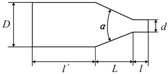According to the shape of the inner hole, the nozzles can be cylindrical, conical-straight, streamlined, etc. The conical-straight nozzle is the most commonly used water jet nozzle due to its significant flow coefficient [27,28,29]. The conical-straight nozzle was taken as the prototype, and its physical model was simplified and obtained, as shown in Figure 2. The parameters of the nozzle structure is shown in Table 1.