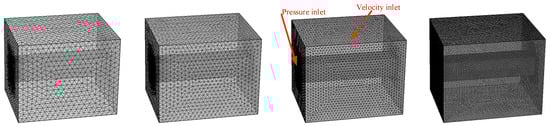 The size of the three-dimensional flow field was set to 5 m × 4 m × 4 m to investigate the effects of side wind on the properties of the jet flow field. When meshing, the mixed grid was applied in the computational domain (Figure 3), divided into two parts: the near-axis area through which the water jet flows, and the far-axis area away from the water jet. The scope of the paraxial area was 1 m. The above two areas had meshed independently. The near-axis area was meshed using a hexahedral grid with better calculation performance. The grid size increased gradually from the inside to the outside with a growth rate of 1.2, and the initial minimum edge length was 0.1 mm. The far-axis area was meshed using a tetrahedral–hexahedral mixed grid with a larger size, as shown in Figure 3.