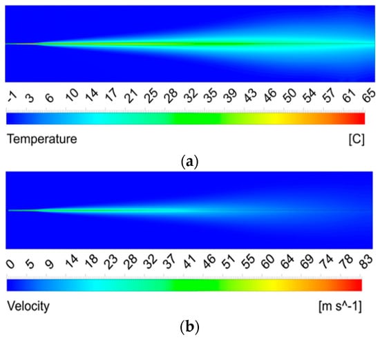 The numerical calculation results of the water jet when the ambient wind speed is 0 m/s: (a) The temperature contour of the water jet. (b) The velocity contour of the water jet.
