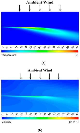 It can be seen from Figure 4 and Figure 5 that regardless of the presence of ambient wind, after the water jet sprays from the nozzle, the jet temperature and velocity gradually decrease along the axial direction, and the radial diffusion width gradually increases. Compared with 0 m/s, the core part of the temperature and velocity of the water jet is shifted along the direction of the wind speed due to the transverse wind blowing.