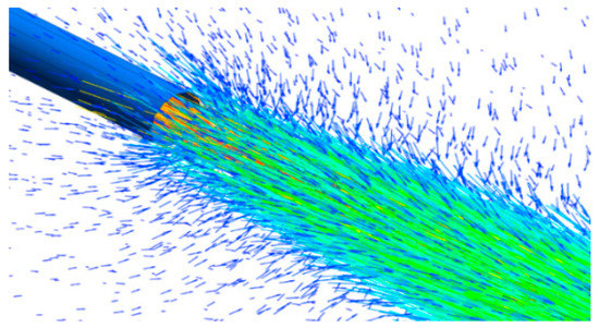 The temperature and velocity attenuation of the water jet are negatively correlated with the air entrainment along the way or the jet distance [33]. Figure 6 shows the velocity vector diagram at the nozzle outlet; the color difference represents the difference in speed. It can be seen from the figure that the high-speed water jet and the ambient air converge at the nozzle outlet, and the velocity value and direction of the two fluids are different. Under the entrainment of the longitudinal vortex [33], air approaches the main body of the water jet and turbulently moves forward with it, forming a gas–liquid two-phase mixed layer at the jet boundary. The violent momentum exchange and heat transfer occur between the entrained air and the water column, so the entrainment degree of the water jet is an essential factor affecting the jet’s temperature and velocity.