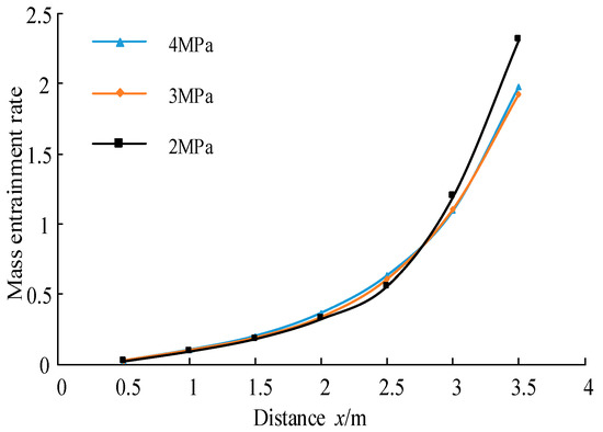 Figure 7 shows the mass entrainment rate and the axial distance when the outlet pressures are 4, 3, and 2 MPa. It can be seen from the figure that the mass entrainment rates under the three pressures increase with the increase in the axial distance and, especially when the distance x > 2.5 m, the mass entrainment rates increase rapidly. The above phenomenon indicates that, as the distance increases, more and more air is gradually entrained at the jet edge and approaches the center of the water jet. The edge of the water jet is “torn” by the air and gradually separates from the main body of the water column, forming a boundary layer with a lower velocity. Therefore, the jet’s temperature and velocity decrease progressively along the axis, and its diffusion width gradually increases.