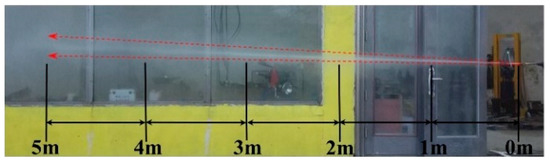- With the increase in distance, the jet entrains more air, causing the randomness of movement to become greater, and the water column diverges accordingly. For example, “break” occurs after the jet distance reaches 3 m in the condition of 1.2 mm nozzle diameter and 1.5 MPa outlet pressure, as shown in Figure 9c. With the increase in water jet injection distance, air entrainment intensifies, and the water column gradually absorbs air. Due to the doping of air, the motion of the water jet is slow and random, and the velocity is reduced to a slower speed. With the increase in jet length, the jet absorbs more and more air and is isolated into multiple water blocks by the air, resulting in a “break”;