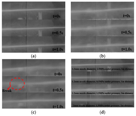 The diffusion state of the water jet in the experiment is shown in Figure 8. The water column was photographed in sections with a high-speed camera to observe the internal flow of the water jet. The photographed results are shown in Figure 9 (test condition: the frame rate of the high-speed camera is 100 frames/second; in Figure 9a–c the nozzle diameter is 1.2 mm, and the outlet pressure is 1.5 MPa; Figure 9d shows the comparison of experimental results under different distance away from the nozzle, outlet pressures and nozzle diameters).