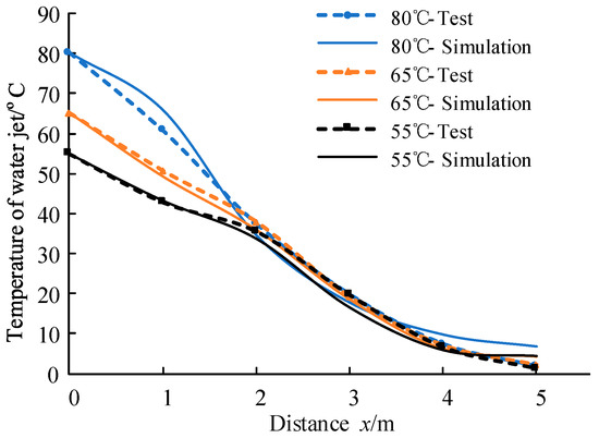Figure 10 depicts a comparison between numerical results with experimental water jet temperature readings. It can be seen that the two are in excellent accordance, showing that the numerical water jet calculation model is reasonable and that the attenuation law of the water jet temperature may be derived from it. The difference is concentrated in 0–2 m and 4–5 m, because the entrainment rate of the jet increases with the increase in the axial distance—especially when the distance x > 2.5 m—and the mass entrainment rate increases rapidly.