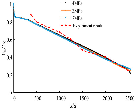 - Taking the numerical result of 4 MPa as an example, when x = 1000d—that is, 1.5 m away from the nozzle outlet—the axial velocity Um = 57.11 m/s, which decreases to 64.73% of the outlet velocity (U0 = 88.23 m/s). When x = 2500d—that is, 3.75 m away from the nozzle outlet—the axial velocity Um = 22.25 m/s, which decreases to 25.22% of the outlet velocity U0. The numerical simulation results agree well with the experimental results in the literature [36,37]; that is, the axial velocity of the water jet shows linear attenuation, and the axial velocity is ~0.7U0 at 1000d and ~0.25U0 at 2500d.