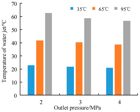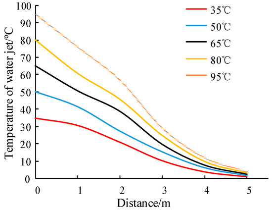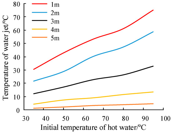 - The temperature of the water jet is positively correlated with the hot water’s initial temperature. Compared with 35 °C, the water temperatures of 50–95 °C increased the jet temperature by 33.67%, 86.73%, 119.48%, and 172.82%, showing an approximately linear increase;