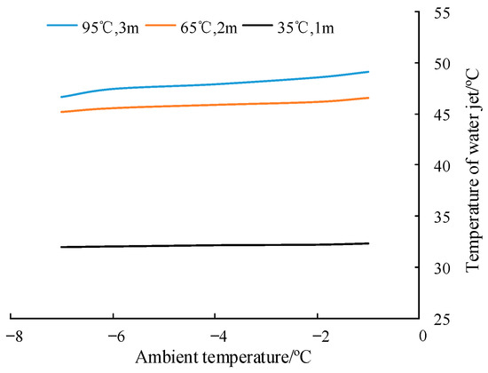 When the initial temperature of hot water and the ambient wind speed are constant, the temperature of the water jet decreases with the decrease in the ambient temperature, which is generally linear. Each time the ambient temperature decreases by 1 °C under this condition, the water temperature decreases by approximately 0.375 °C.