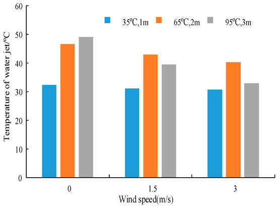 As shown in Figure 16, when the initial temperature of the hot water and the ambient temperature are constant, the temperature of the water jet decreases as the wind speed increases. Compared with the windless condition, the water jet temperatures of 1.5 m/s and 3 m/s reduced by 7.59% and 13.46%, respectively.