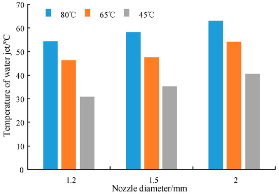For example, when the nozzle diameter increases from 1.2 mm to 2 mm, the water jet temperatures at 2 m distance of 80 °C, 65 °C, and 45 °C initial temperature increase from 54.32 °C, 46.41 °C, and 30.87 °C to 63.15 °C, 54.02 °C, and 40.58 °C respectively, with increases of 16.27%, 16.40%, and 31.45%. The lower the initial temperature of the hot water, the more the nozzle diameter will increase the temperature of the water jet.
