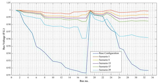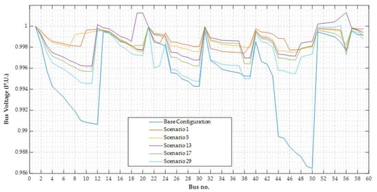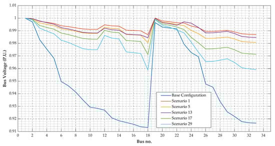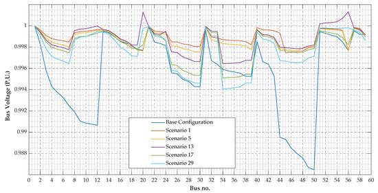For improving the voltage profile, minimizing the overall aggregated voltage deviation index ( for all different considered scenarios is also set as an objective for the optimization problem. For each scenario, the aggregated voltage deviation index ( is calculated as the sum of voltage deviations of load buses from unity as follows: