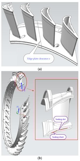 Schematic diagram of the installation position of the actual turbine blade edge plates. (a) The installation position of the sealing sheet. (b) Section of the installation position for the sealing sheet.