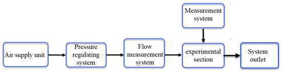 An experimental system was built to study the effect of edge plate clearance and sheet spacing on the leakage characteristics of the turbine blade edge plates. During the design of the experimental bench, the clearance guarantee, air intake method, experimental section processing and the versatility of the experimental bench are considered, and experiments with different geometrical conditions are realized by replacing the experimental pieces and the clearance adjustment blocks. The experimental system is shown in Figure 2. Specifically, it includes an air supply unit, a pressure regulating system, a flow measurement system, and an experimental section. The air supply system (air source) is mainly composed of a large-volume air storage tank and a cold dryer. The air dryer dehumidifies and dries the airflow to prevent moisture in the airflow from corroding downstream metal pipes and experiment parts. The volume of the air storage tank is 300 m3, which can maintain the stability of the gas pressure. There will be no large fluctuations in pressure during the experiment; the measuring system includes measuring equipment and connecting pipelines for measuring the pressure, temperature and mass flow of the experimental piece, and mass flow is measured by laminar flow meters. The acquisition system captures the signal of the measurement system and sends it in real-time to the computer for display and storage. The adjustment of the inlet pressures is completed by the pressure adjustment system.