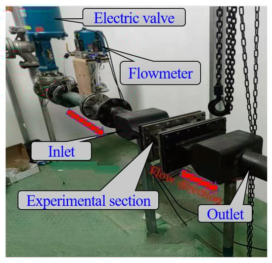 Figure 3 is a photo of the experiment bench. The components along the flow direction of the airflow are an electric valve, a flow meter, an inlet section (inlet flange, inlet cavity, rectifying section), an experimental section, and an outlet section. The volume of the intake cavity in the inlet section is designed to be large enough to reduce the incoming stream velocity and stabilize the incoming stream pressure. At the same time, the rectifying section is designed with a Vickers curve, which allows airflow to enter the experimental section smoothly. To facilitate the installation of the outlet flange and the experimental section, the outlet section is designed as a small cavity. Through an inclined plane, it transitions to a large cavity. There are slots on the surface of the inlet and outlet flanges, and sealing gaskets are placed to seal the front and rear ends.