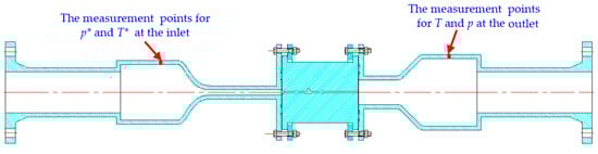 After systematic analysis, the layout of the pressure and temperature measuring points of the experiment bench is shown in Figure 4. During the experiment, the mass flow was so small that the maximum flow velocity did not exceed 1 m/s at the inlet section and outlet section. Therefore, the difference between the total pressure and the static pressure is within 0.01%. The static pressure measurement is more convenient and reliable than the total pressure measurement, so the inlet total pressure measurement is replaced by the static pressure measurement. The measuring points are arranged in the middle of the inlet and take the average pressure of the two symmetrical positions. In addition, because the low flow rate, outlet pressure and atmospheric pressure are so closely related, their differential pressure can be ignored. Thus, the outlet pressure can be atmospheric pressure, and the outlet pressure monitoring points are located in the middle of the outlet cavity. The measuring points of the inlet temperature and outlet temperature are arranged on the inlet and outlet chambers.