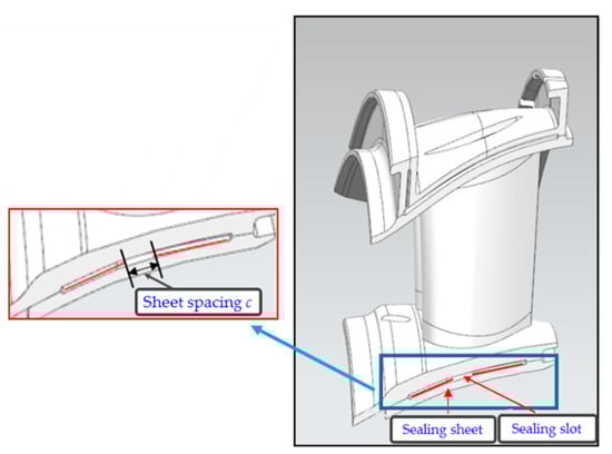 (2) Sheet spacing c (mm) (as shown in Figure 6): Due to the assembly process, the inevitable existence of spacing leads to using multi-piece segmented sealing sheets in turbine blade edge plates. Thus, two-piece segmented sealing sheets are used. The sheet spacing c is the installation spacing between the two-piece sealing sheets.
