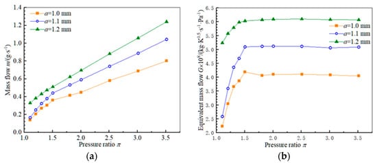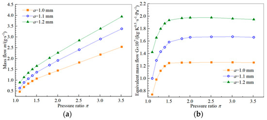From Equation (11), the maximum value of the equivalent mass flow is only related to the throat area (A2). Because the throat area remains unchanged, after reaching the critical state, the equivalent mass flow cannot increase any further, and remains unchanged. Due to the energy dissipation in the actual flow process, the critical pressure ratio occurs around 2. The experimental results and theoretical analysis are in agreement regarding the variation law of the equivalent mass flow with pressure ratio.