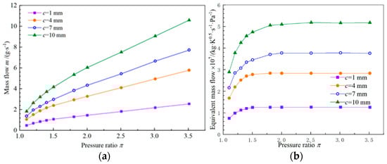 Figure 11a,b shows the clearance leakage and equivalent mass flow of the clearance leakage with the pressure ratio. It can be seen from Figure 11a that with the increase of the sheet spacing, the clearance leakage also gradually increases. When the pressure ratio is 3.5, and sheet spacing rises from 1 mm to 4 mm, the clearance leakage is increased by approximately 400%. As the sheet spacing is increased from 4 mm to 7 mm, the clearance leakage is increased by approximately 48%. As the sheet spacing rises from 1 mm to 10 mm, the flow increases by approximately 1185%. That is why the flow resistance coefficient gradually decreases with the increase of the sheet spacing. It can be seen from Figure 11b that as the pressure ratio rises, the equivalent mass flow begins to increase. When the pressure ratio goes up to about 2, the equivalent mass flow remains unchanged, although the pressure ratio has gone up.