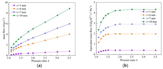 Experiment with different edge plate clearances. (c = 1 mm). (a) Clearance leakage against pressure ratio. (b) Equivalent mass flow of clearance leakage against pressure ratio.