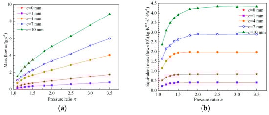 Experimental results of different edge plate clearances (c = 1 mm). (a) Total leakage against the pressure ratio. (b) Equivalent mass flow of total leakage against pressure ratio.