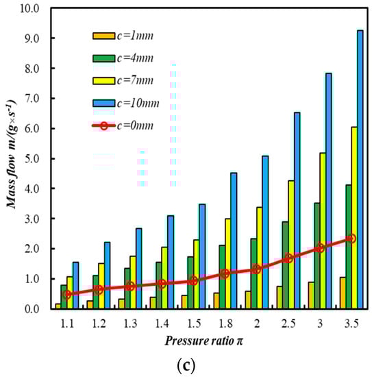 Figure 12 shows the comparison of leakage for bypass and clearance. The red line in the figure (a = 1.0 mm, c = 0 mm) is the bypass leakage. With increasing sheet spacing, the proportion of leakage length Y increases, and the proportion of clearance leakage in the total leakage gradually increases. When the pressure ratio exceeds the critical pressure ratio of 2.0, the equivalent mass flow will not change. When the sheet spacing is 1 mm, the bypass leakage is twice the clearance leakage. Bypass leakage accounts for 68% of the total leakage and is the main source. However, with the increase of sheet spacing, the proportion of clearance leakage gradually increases. When the sheet spacing is 10 mm, the proportion of clearance leakage has reached 83%, which has become the primary source of leakage.