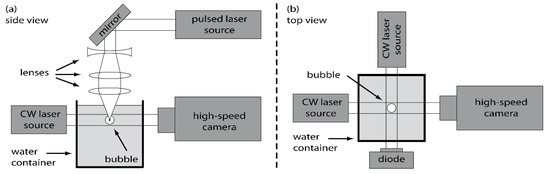 The cavitation bubble is generated by focusing a high-energy laser pulse into water (see Figure 1a). The laser source is a Q-switched Nd:YAG laser (Saga, B.M. industries) generating pulses of 7 ns duration, and 10 mm diameter, at a wavelength of 1064 nm, and a maximum energy of 2300 mJ/pulse. The laser pulse is expanded by one diverging lens (focal length f = −50), and one converging lens (f = +100), before being focused by another converging lens (f = +20) into a cubic water container with sides measuring 50 mm.