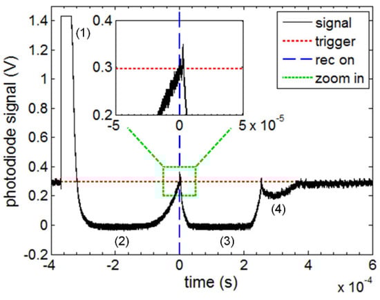 (Black solid line) Photodiode signal for the collapsing bubble, (red dotted line) trigger level for the beginning of high−speed video, (blue dash line) video start (t = 0), (green boxed) zoom in the t = 0 region. (1) Intensity peak due to the flash of the laser generating the bubble, (2) first bubble, (3) rebound bubble, and (4) second rebound bubble.