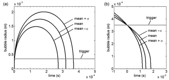 (a) Graph of the estimated bubble radius as a function of time for the average, the average plus standard deviation, and the average minus standard deviation bubble. The interval of time when the collapse can occur is 94 µs. (b) Zoom in and superposition of the collapse curves, as if the trigger was set at 20% of the average maximum radius. The interval of time when the collapse can occur is drastically reduced from 94 µs to 0.65 µs.