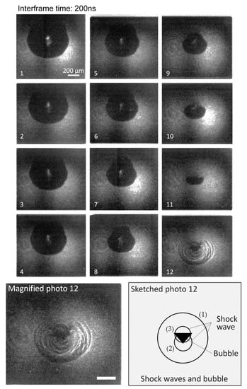 High−speed video imaging of the collapse of a quasi-spherical bubble. The series of photos are numbered 1 to 12 over time. The collapse is not perfectly spherical, which denotes the formation of a microjet. Several shock waves are visible at the collapse (photo 12, magnified photo 12), and drawn on the sketch of the main shock waves and the collapse bubble (sketched photo 12 (bottom-right)). The shocks are assumed to be a water hammer shock wave (1) and compression shocks waves (2) and (3) in the sketch. This collapse type is classified to the quasi-spherical bubbles. Camera settings are: 5 million frames/s, and 5 ns exposure time. The scale bar is 200 µm.